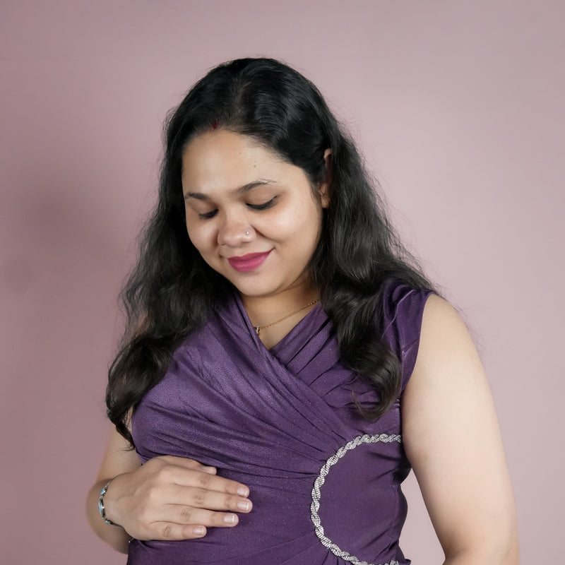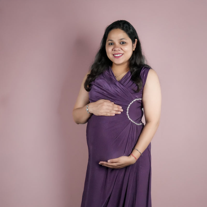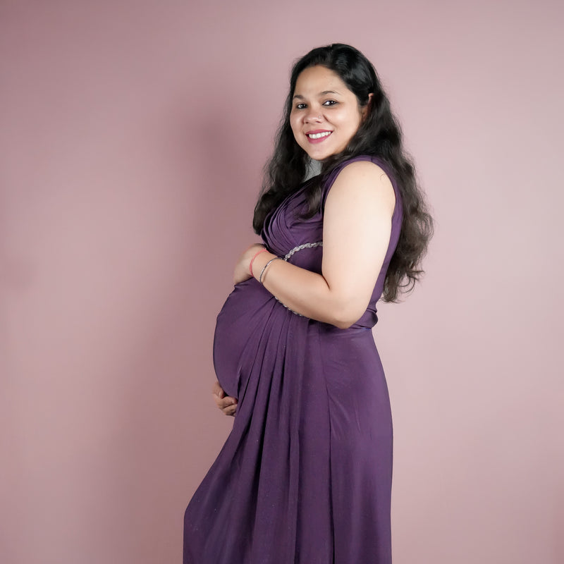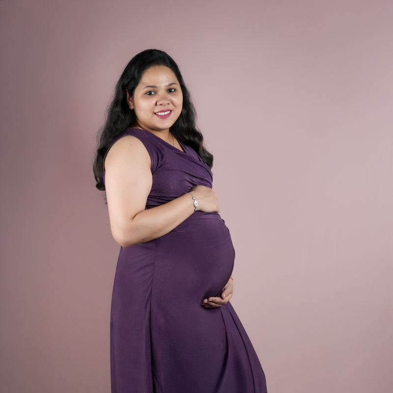 A comfy and stylish maternity dress with soft purple shimmer crafteed rto move with your bump and make every celebration feel extra special.
