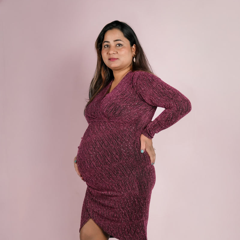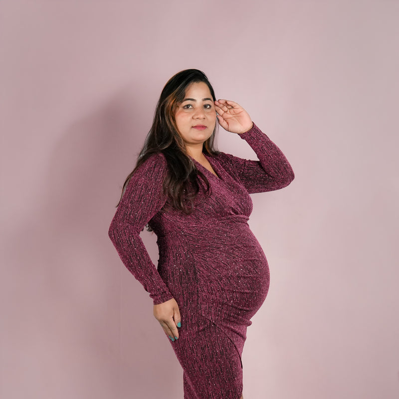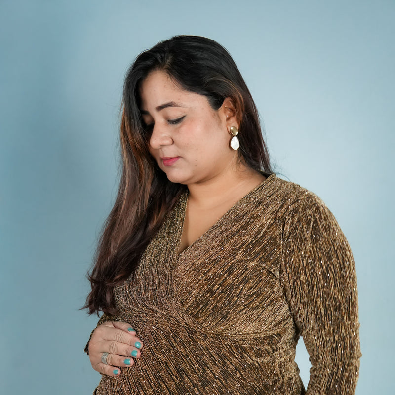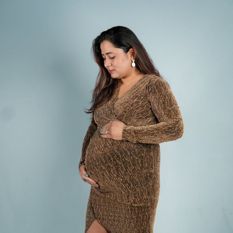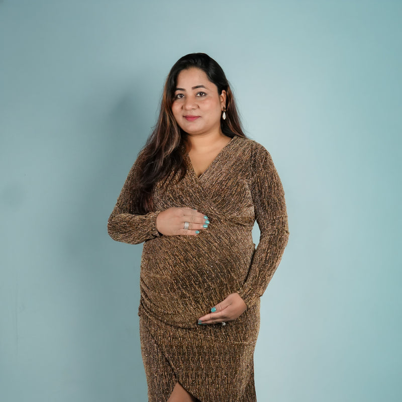 Antique gold shimmer psrty dress designed for expecting mothers , featuring a subtle shimmer finish, its perfect for parties, baby shower and paerfect for outings too!.*perfect for all trimisters*bump-friendly stretchable fabric